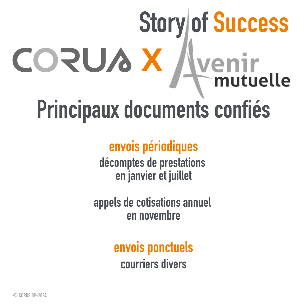 Depuis 2011, Avenir Mutuelle confie à CORUS la gestion de plusieurs documents sortants périodiques. Il s’agit en particulier des décomptes de prestations édités et envoyés deux fois par an, en janvier et en juillet.